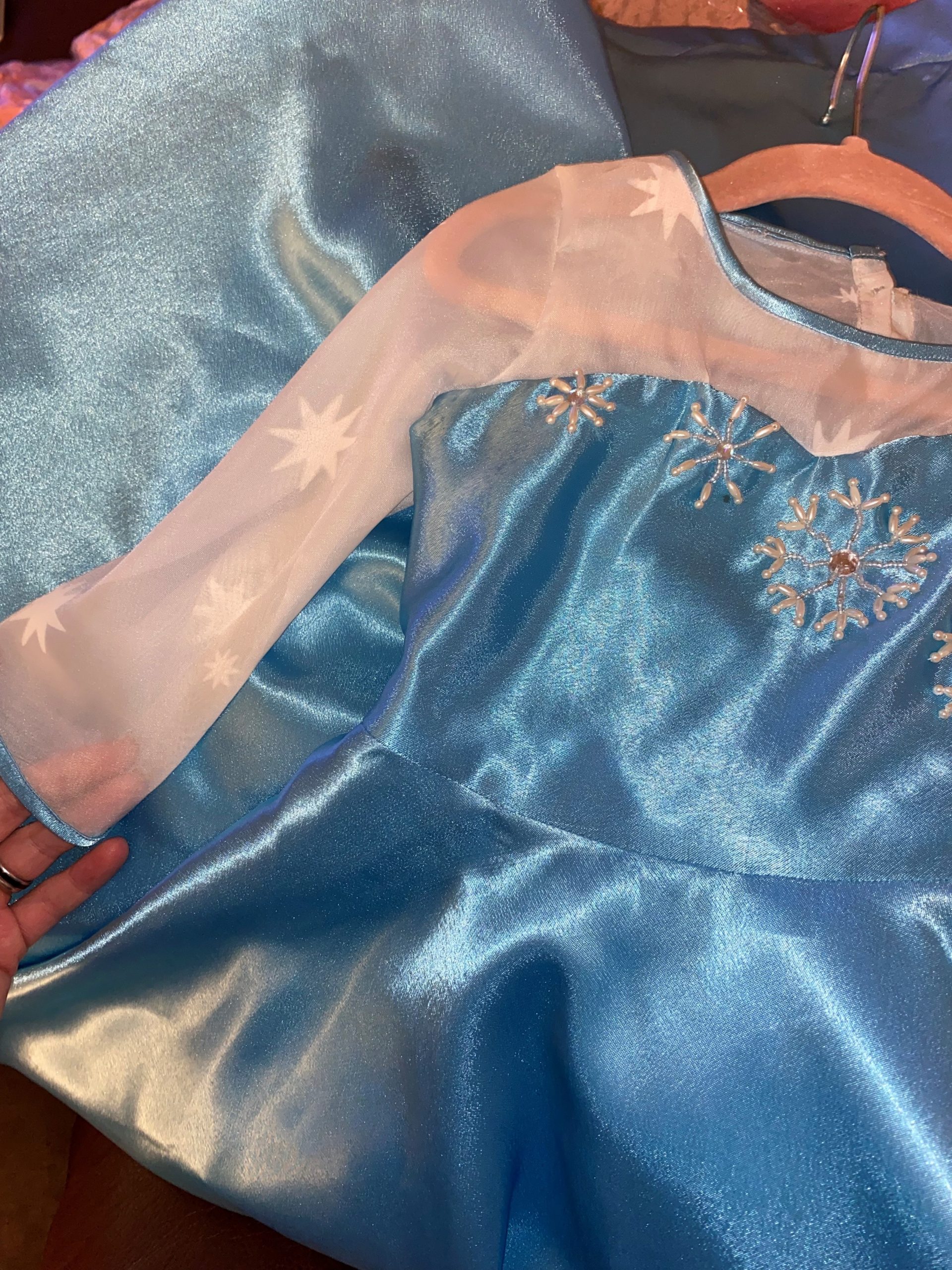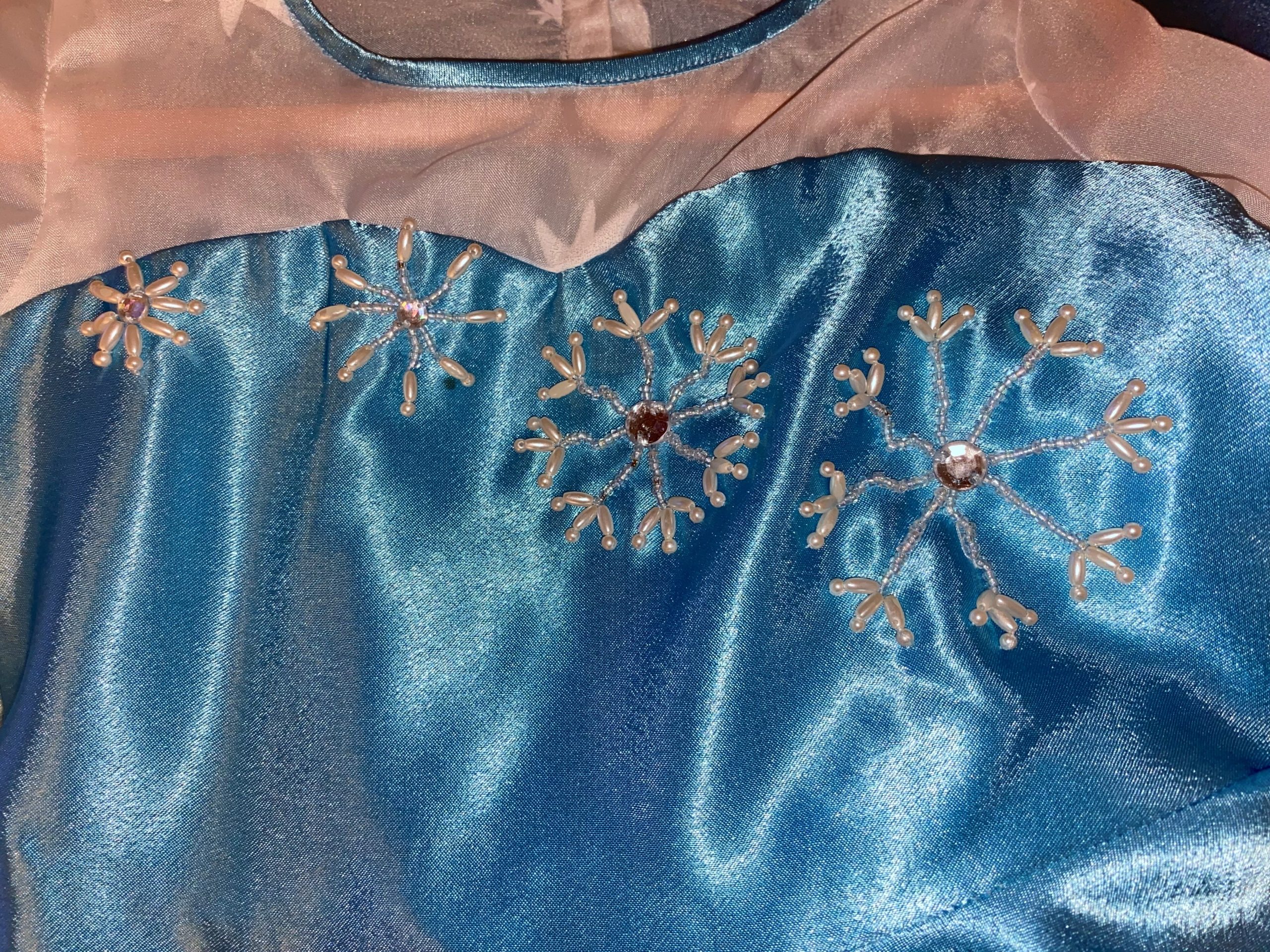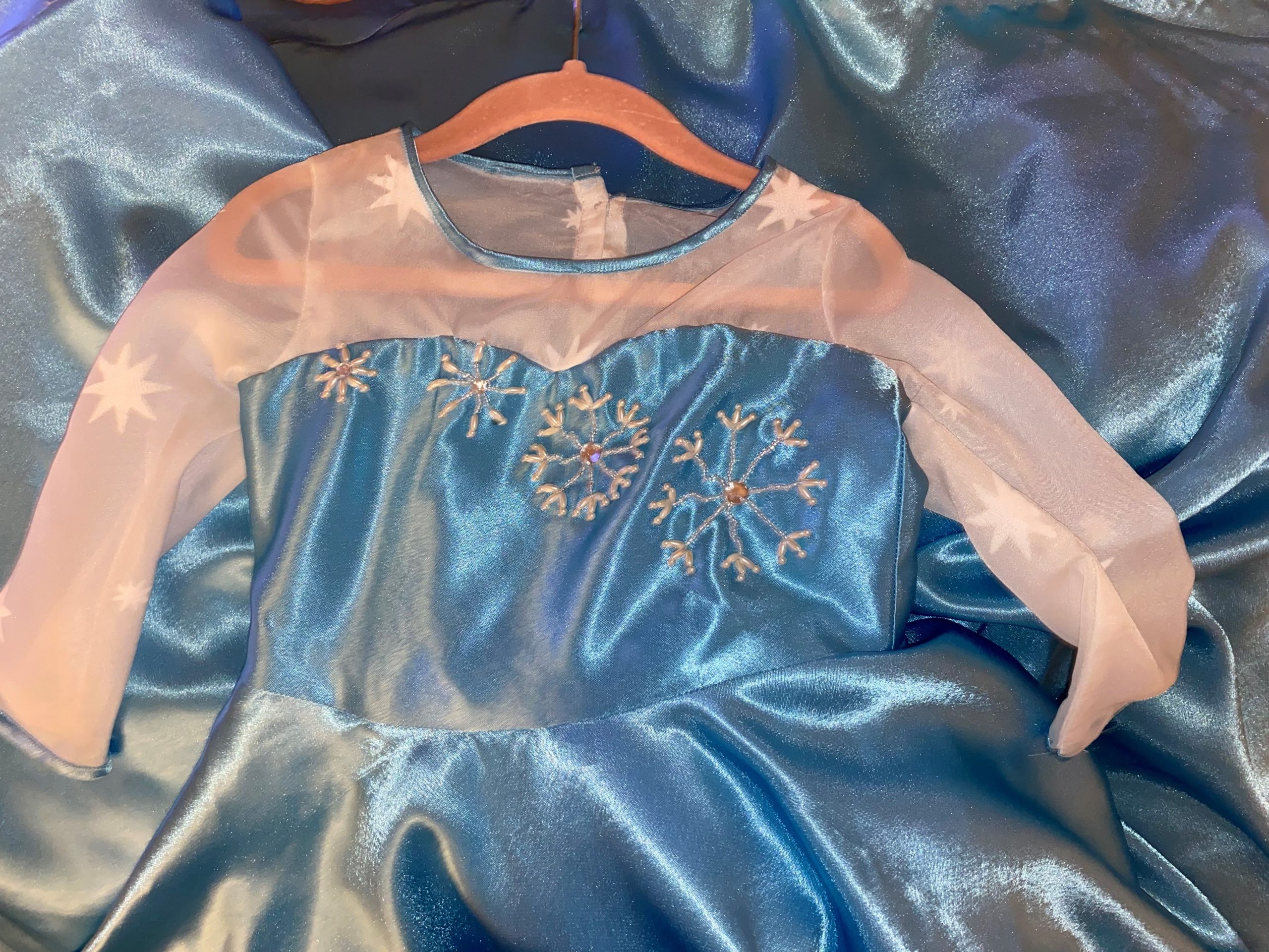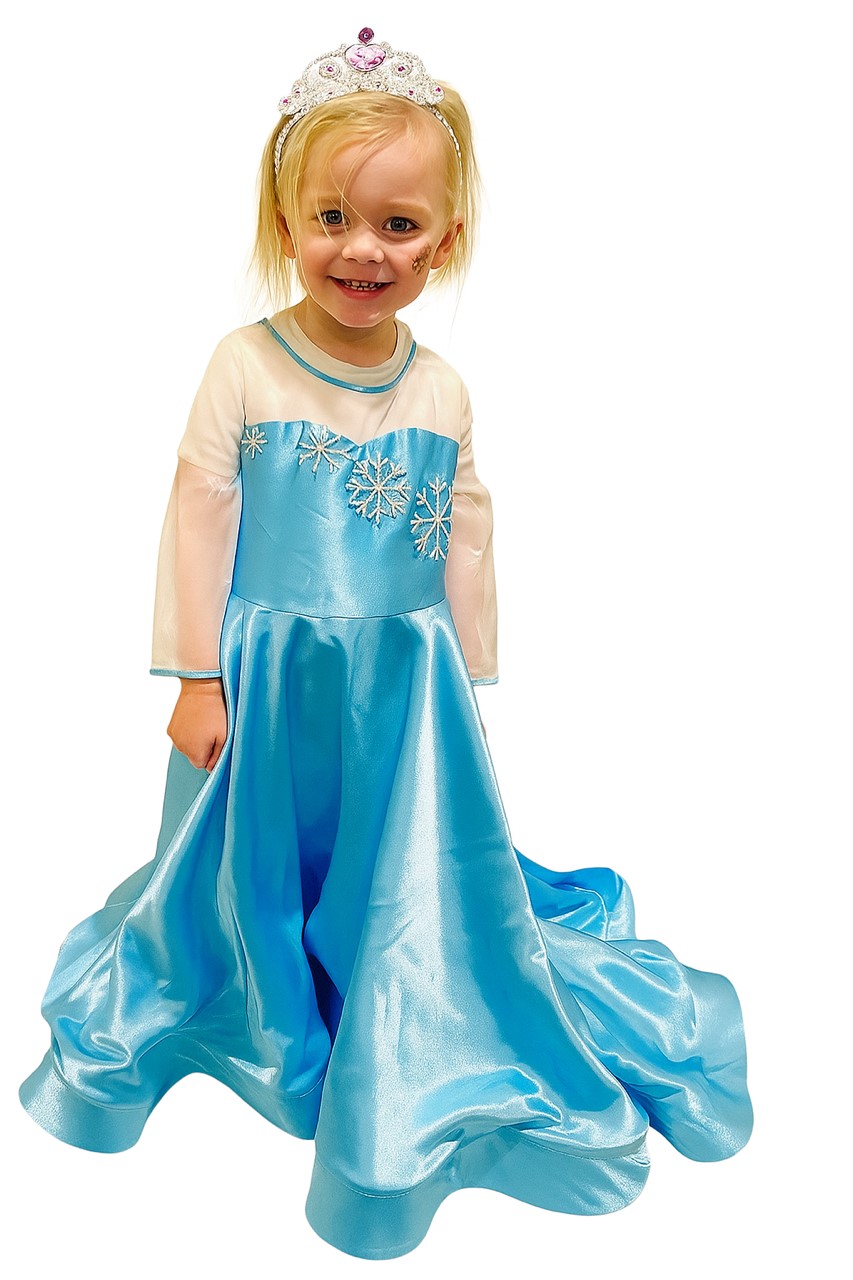 Inspired by Queen Elsa, your little one will love this detailed satin dress. With stary snowflake sleeves and hand embroidered snowflake beaded bodice your little girl will feel like a true ice queen.